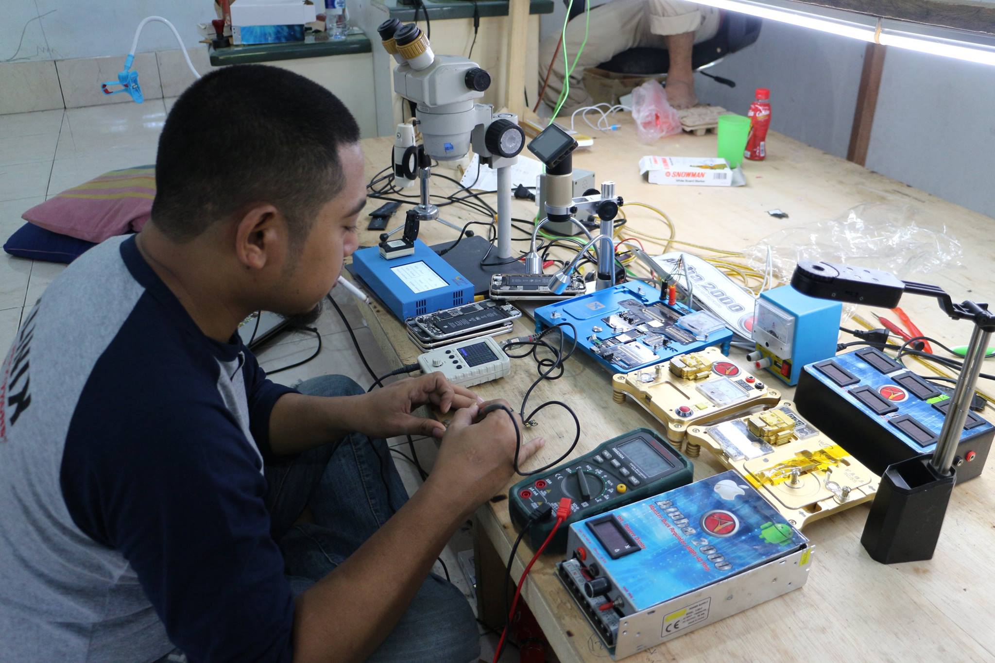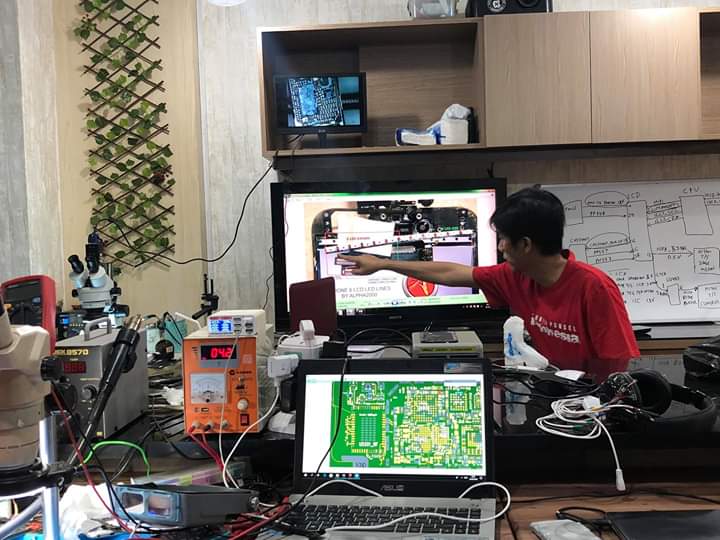 Dokumentasi kegiatan pelatihan teknisi smartphone di ALPHA2000 Smartphone Training Center. Kegiatan belajar meliputi praktik analisa kerusakan, pengukuran jalur mainboard, perbaikan hardware iPhone dan Android, serta praktik langsung menggunakan peralatan service profesional. Peserta pelatihan berasal dari berbagai daerah di Indonesia bahkan dari luar negeri, sehingga menciptakan komunitas teknisi yang saling berbagi pengalaman dan pengetahuan di dunia perbaikan smartphone.